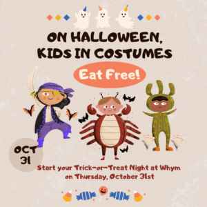 Head on into Whym before Trick-or-Treating! Kids in costumes eat FREE!
