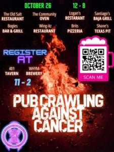 Back by popular demand! This years “Pub Crawling Against Cancer” event will take place Saturday October 26th from 12-8.