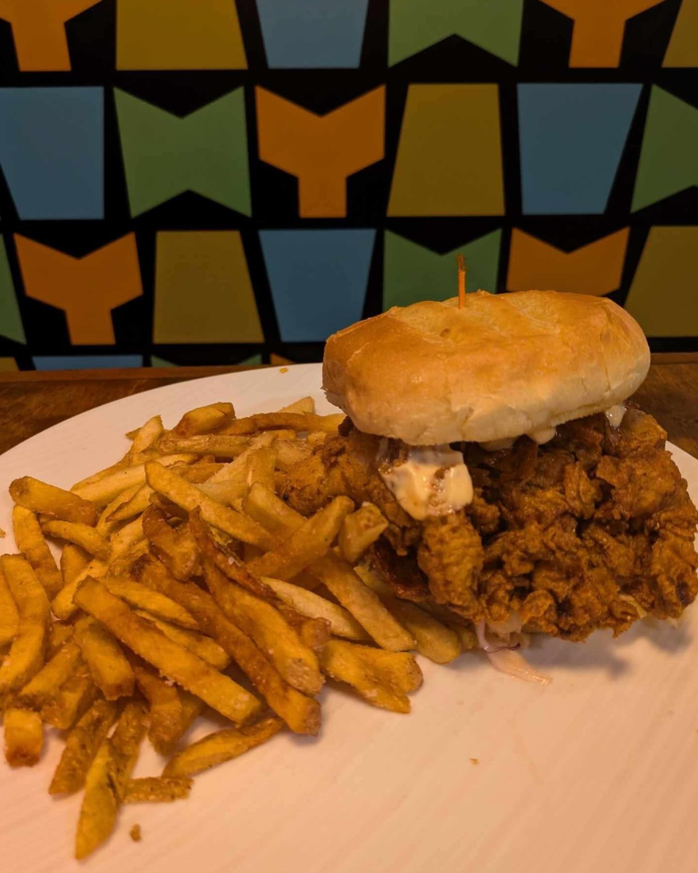 Southern Fried Chicken Sandwich: Cajun fried chicken with pickled jalapeno slaw, spicy garlic mayo, and frites on the side