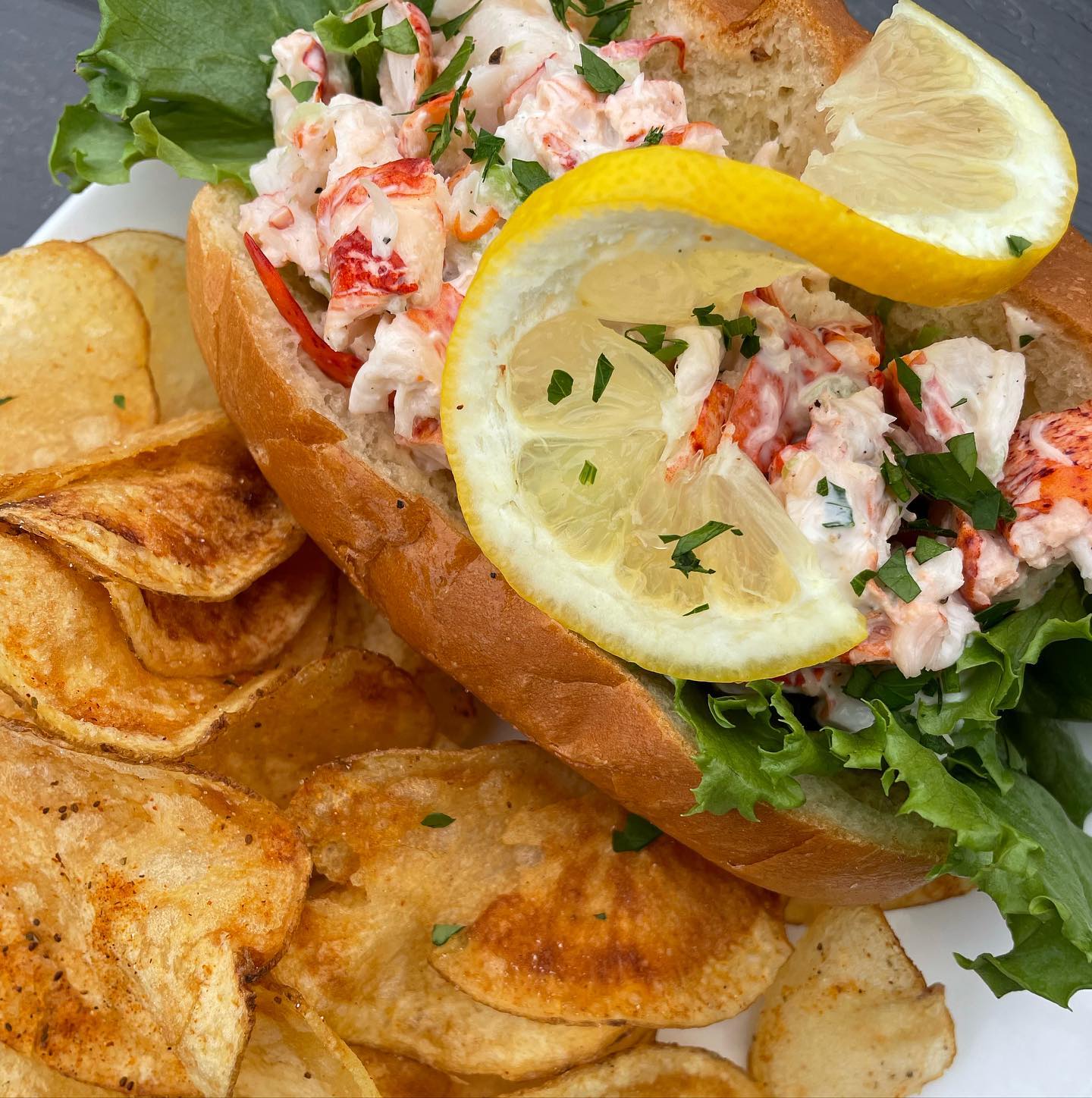 David’s Fish Market caught lobster • light mayo • salt & pepper • celery • brown butter toasted piantadosi bakery brioche bun • served with house cut old bay seasoned potato chips • New Hampshire on a plate!