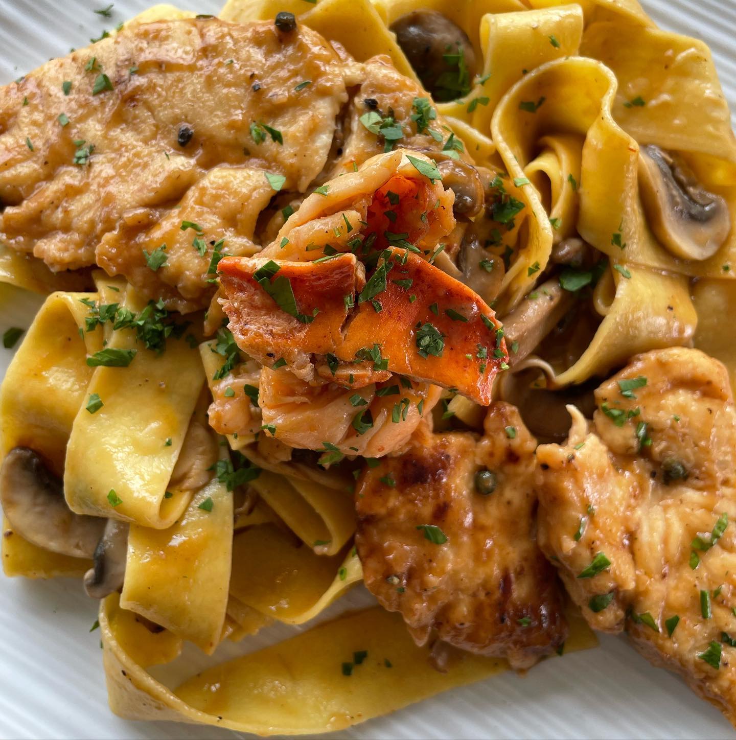 nitrate free chicken tenderloin • local lobster claw and tail meat • mushrooms • peppercorn marsala gravy • flat noddles