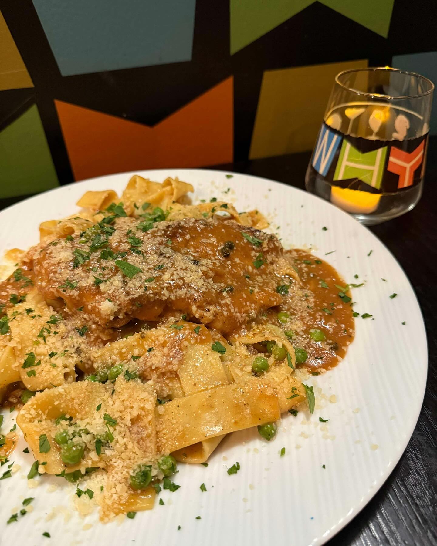 Fresh pappardelle, green peas, and peppercorn mushroom sauce
