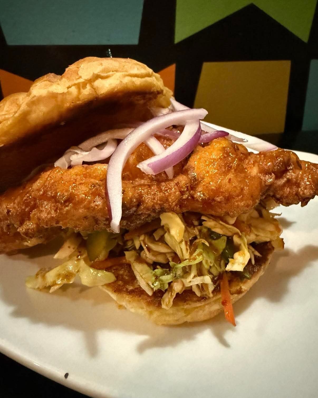Fried chicken breast tossed in Bangkok sauce, topped with sesame seeds, Asian slaw, red onion, and Sriracha aioli on a toasted bun, served with house-cut Green Thumb potato fries