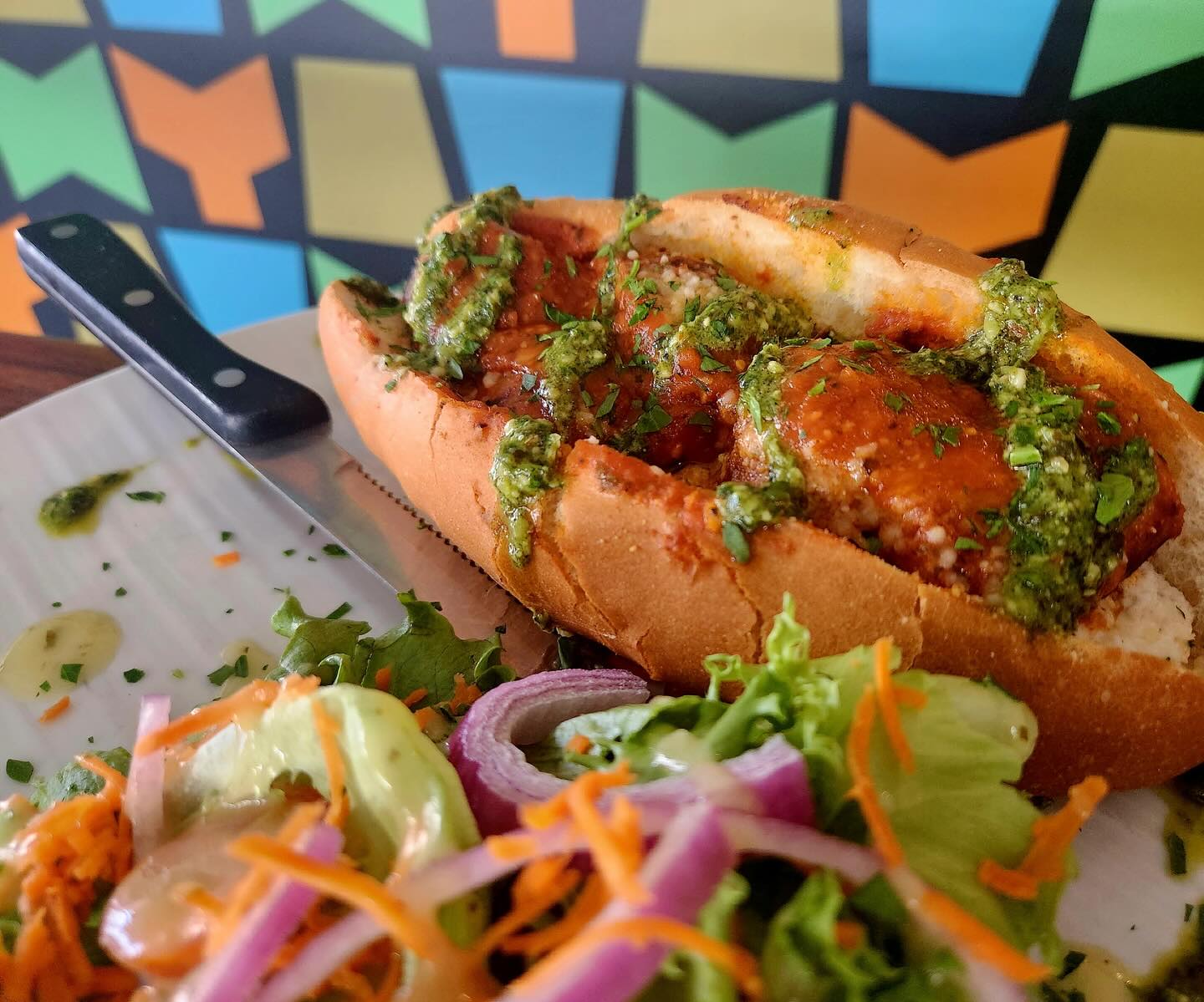 House made Meatballs and Italian sausage sub topped with fresh house made ricotta, red sauce and pesto. Served with a demi salad