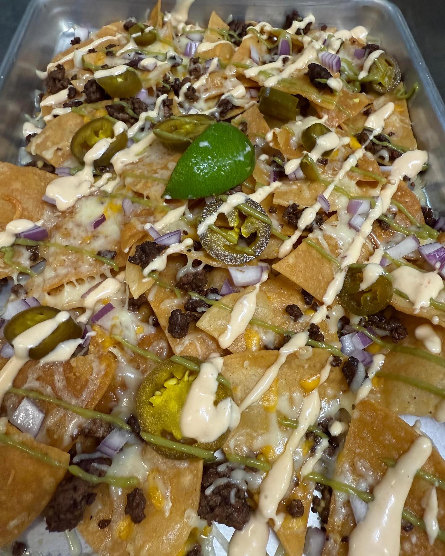 Crispy nachos piled high with mixed cheese, seasoned beef, jalapeños, diced red onion, drizzled with avocado crema and spicy mayo, finished with parsley.