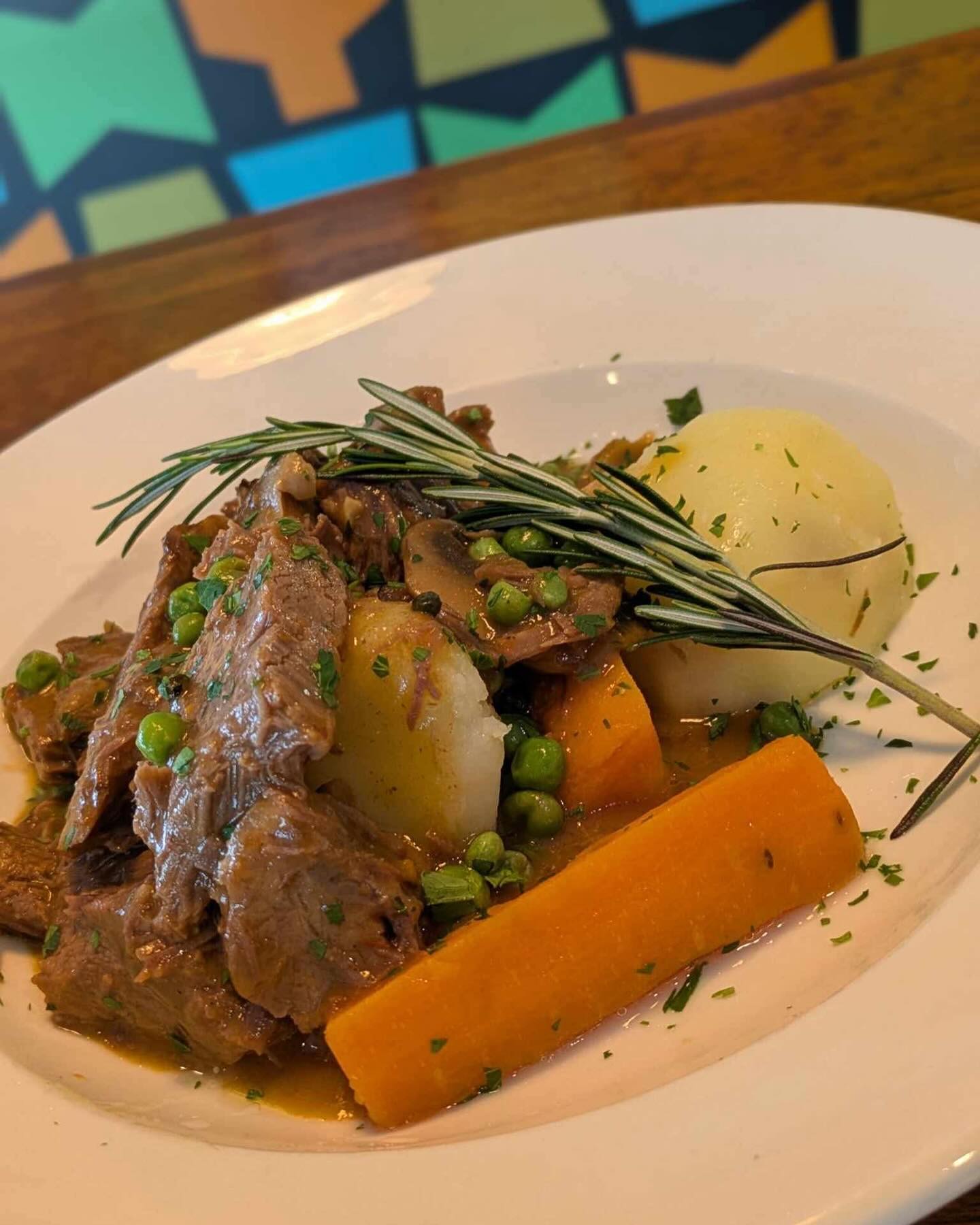 A hearty New England classic featuring slow-braised, tender beef with carrots, potatoes, and peas, all smothered in a rich, savory mushroom-infused gravy.