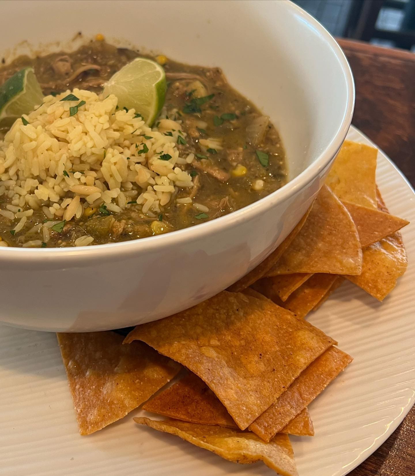 beer braised pork loin • hatch green chiles • tomatillo • roasted corn • potatoes • topped with rice & crisp corn chips