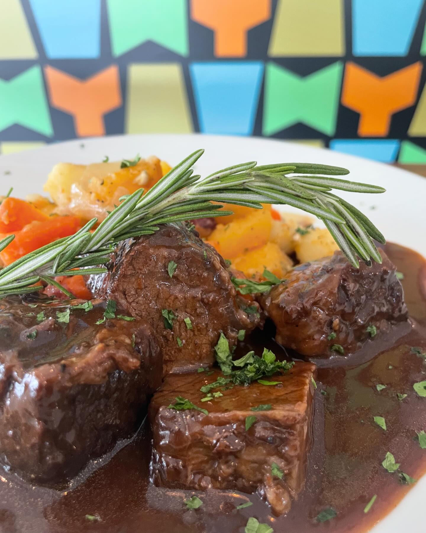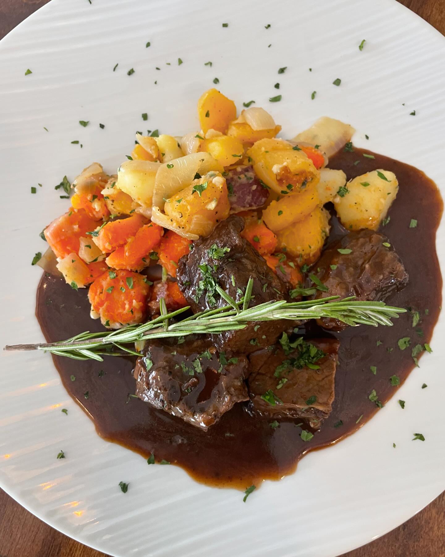fork tender slow beer braised short rib served a red wine reduction and root veg hash