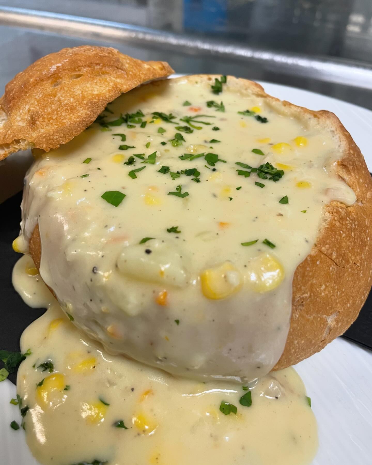 Coach’s famous creamy corn chowder with bacon and vegetables in a baked bread bowl