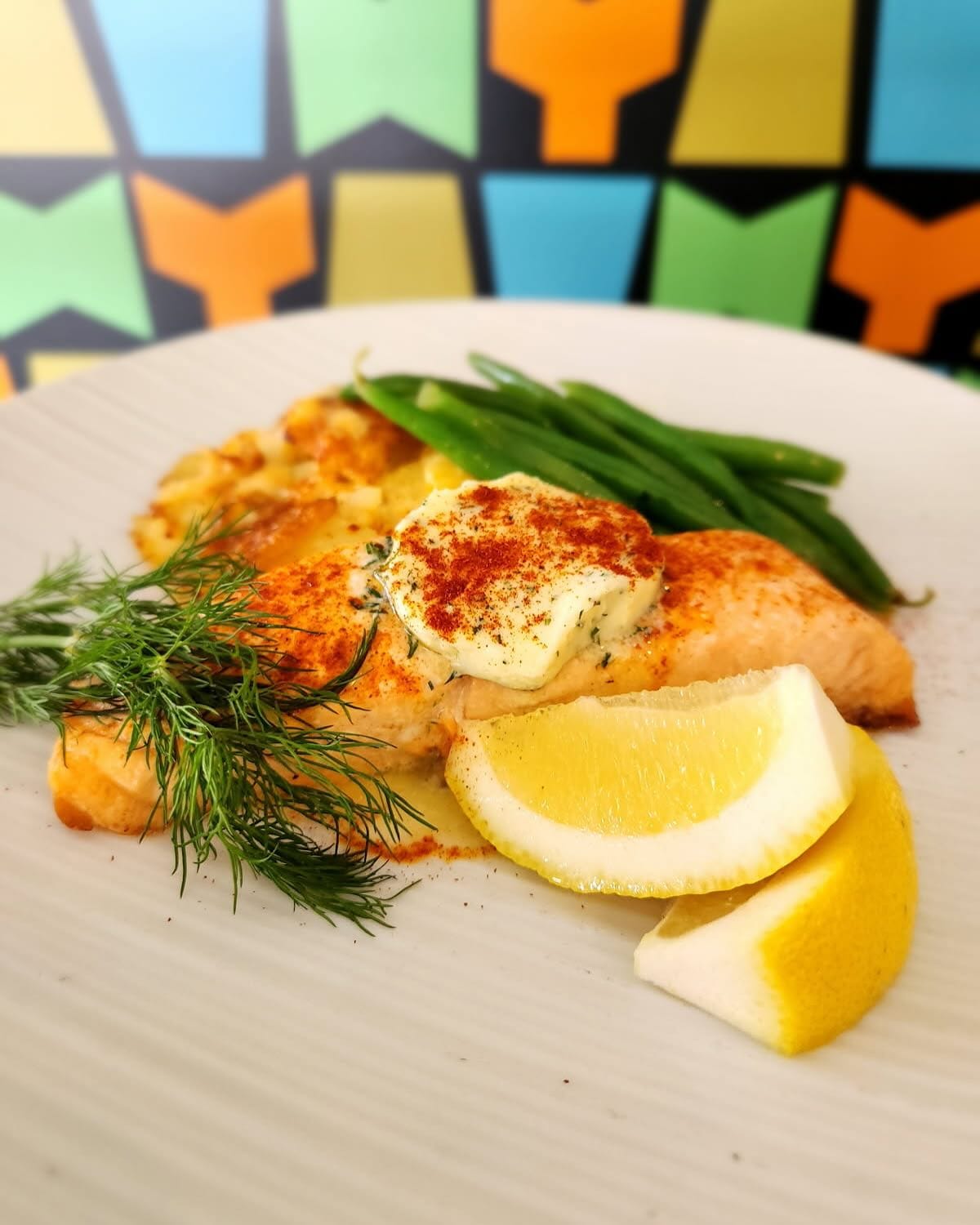 lemon dill butter oven roasted Atlantic Salmon with house au gratin potatoes and haricot vert french cut green beans