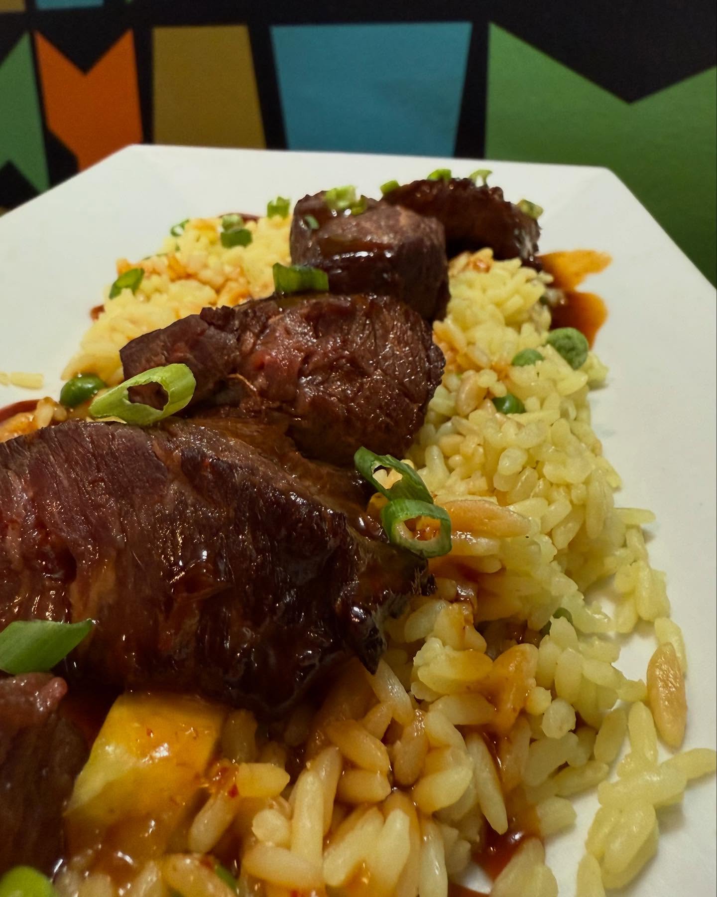 asian fusion marinated beef tips served with pineapple green pea rice pilaf and asian fusion drizzle